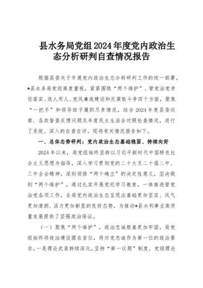 【七哥公文】2025年:县水务局党组2024年度党内政治生态分析研判自查情况报告+更多免费公文+VX:QiGeGongWen2024