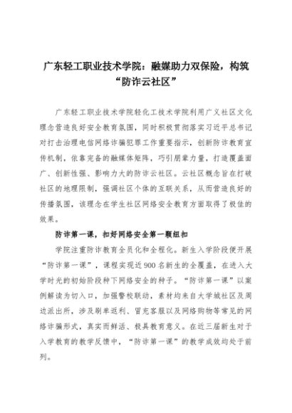 【七哥公文】2025年:广东轻工职业技术学院:融媒助力双保险,构筑“防诈云社区”+更多免费公文+VX:QiGeGongWen2024