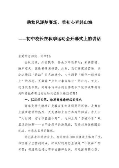 【七哥公文】2025年:初中校长在秋季运动会开幕式上的讲话:乘秋风逐梦赛场,秉初心奔赴山海+更多免费公文+VX:QiGeGongWen2024