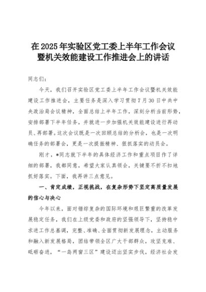 【七哥公文】2025年:在2025年实验区党工委上半年工作会议暨机关效能建设工作推进会上的讲话+更多免费公文+VX:QiGeGongWen2024