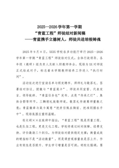 【七哥公文】2025年:2025—2026学年第一学期“青蓝工程”师徒结对新闻稿-青蓝携手立德树人,师徒共进培根铸魂+更多免费公文+VX:QiGeGongWen2024