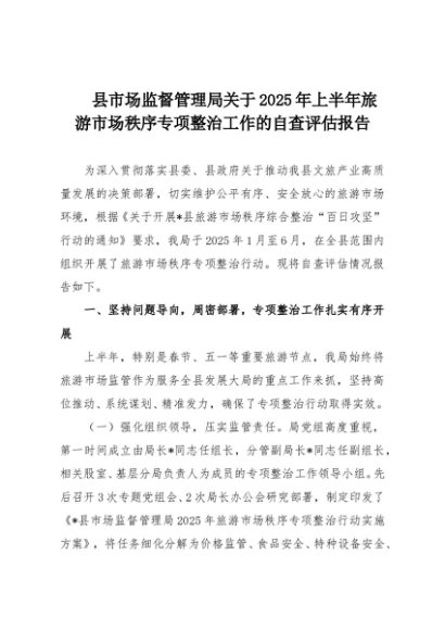 【七哥公文】2025年:县市场监督管理局关于2025年上半年旅游市场秩序专项整治工作的自查评估报告+更多免费公文+VX:QiGeGongWen2024