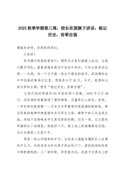 【七哥公文】2025年:2025秋季学期第三周,校长在国旗下讲话:铭记历史,吾辈自强+更多免费公文+VX:QiGeGongWen2024