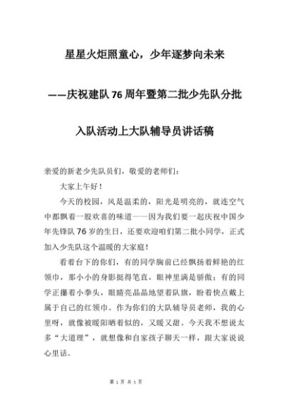 【七哥公文】2025年:庆祝建队76周年暨第二批少先队分批入队活动上大队辅导员讲话稿:星星火炬照童心,少年逐梦向未来+更多免费公文+VX:QiGeGongWen2024