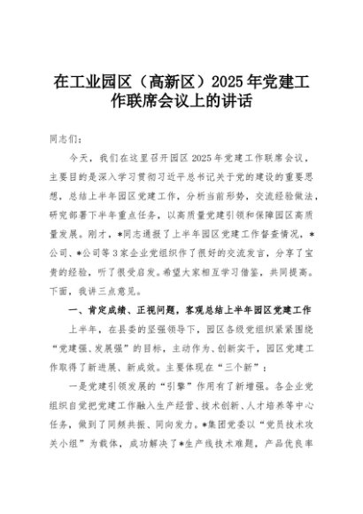 【七哥公文】2025年:在工业园区(高新区)2025年党建工作联席会议上的讲话+更多免费公文+VX:QiGeGongWen2024