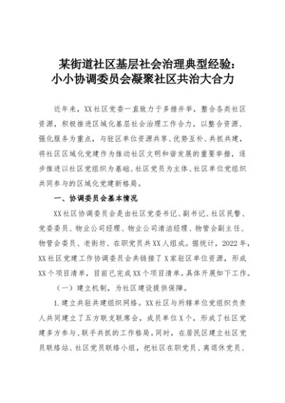 【七哥公文】2025年:某街道社区基层社会治理典型经验:小小协调委员会凝聚社区共治大合力+更多免费公文+VX:QiGeGongWen2024