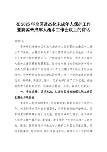 【七哥公文】2025年:在2025年全区常态化未成年人保护工作暨防范未成年人溺水工作会议上的讲话+更多免费公文+VX:QiGeGongWen2024