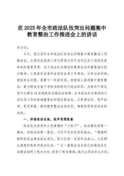 【七哥公文】2025年:在2025年全市政法队伍突出问题集中教育整治工作推进会上的讲话+更多免费公文+VX:QiGeGongWen2024