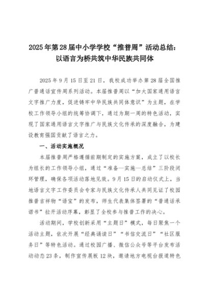【七哥公文】2025年:2025年第28届中小学学校 “推普周” 活动总结 :以语言为桥 共筑中华民族共同体+更多免费公文+VX:QiGeGongWen2024