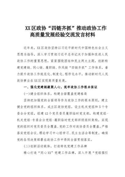 【七哥公文】2025年:XX区政协“四链齐抓”推动政协工作高质量发展经验交流发言材料+更多免费公文+VX:QiGeGongWen2024