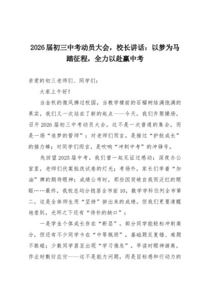 【七哥公文】2025年:2026届初三中考动员大会,校长讲话:以梦为马踏征程,全力以赴赢中考+更多免费公文+VX:QiGeGongWen2024