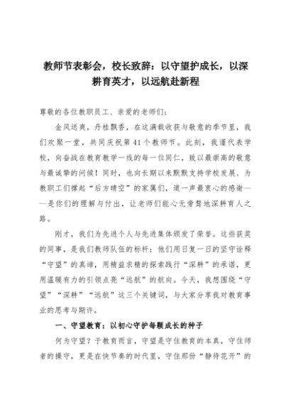 【七哥公文】2025年:教师节表彰会,校长致辞:以守望护成长,以深耕育英才,以远航赴新程+更多免费公文+VX:QiGeGongWen2024