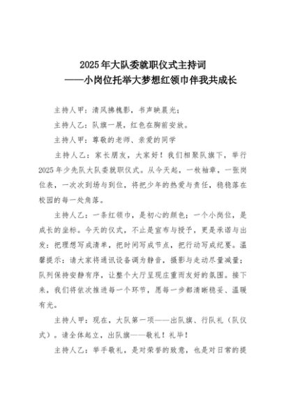 【七哥公文】2025年:2025年大队委就职仪式主持词-小岗位托举大梦想 红领巾伴我共成长+更多免费公文+VX:QiGeGongWen2024