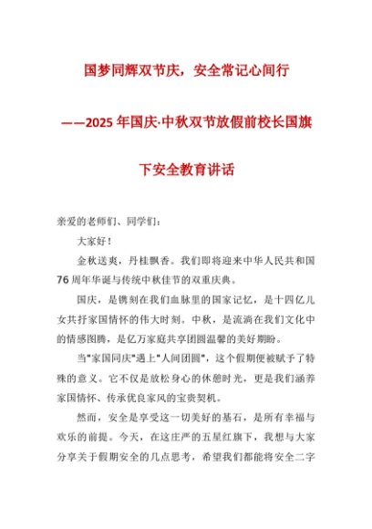 【七哥公文】2025年:2025年国庆·中秋双节放假前校长国旗下安全教育讲话:国梦同辉双节庆,安全常记心间行+更多免费公文+VX:QiGeGongWen2024
