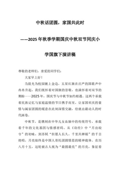 【七哥公文】2025年:2025年秋季学期国庆中秋双节同庆小学国旗下演讲稿:中秋话团圆,家国共此时+更多免费公文+VX:QiGeGongWen2024