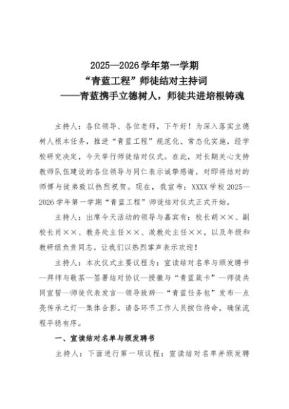 【七哥公文】2025年:2025—2026学年第一学期“青蓝工程”师徒结对主持词-青蓝携手立德树人,师徒共进培根铸魂+更多免费公文+VX:QiGeGongWen2024