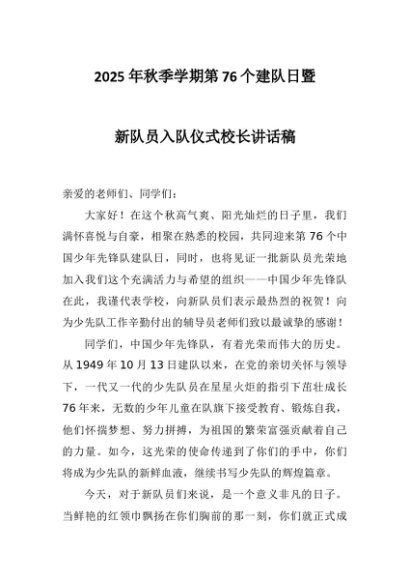 【七哥公文】2025年:2025年秋季学期第76个建队日暨新队员入队仪式校长讲话稿+更多免费公文+VX:QiGeGongWen2024
