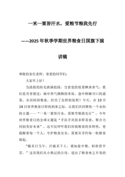 【七哥公文】2025年:2025年秋季学期世界粮食日国旗下演讲稿:一米一粟皆汗水,爱粮节粮我先行+更多免费公文+VX:QiGeGongWen2024