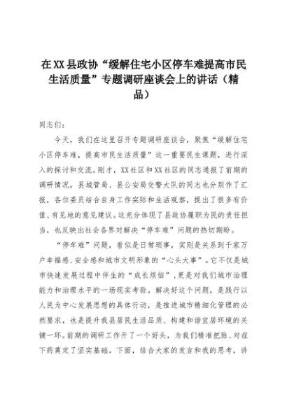 【七哥公文】2025年:在XX县政协“缓解住宅小区停车难提高市民生活质量”专题调研座谈会上的讲话(精品)+更多免费公文+VX:QiGeGongWen2024