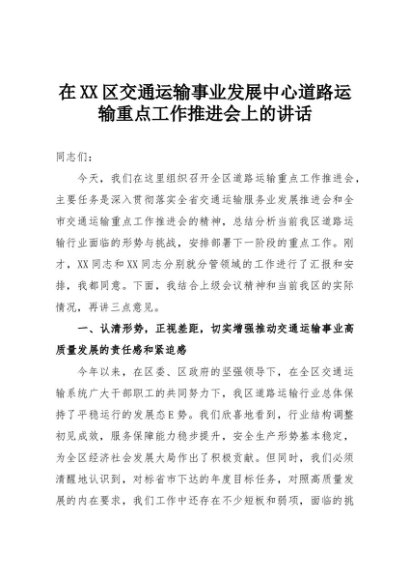 【七哥公文】2025年:在XX区交通运输事业发展中心道路运输重点工作推进会上的讲话+更多免费公文+VX:QiGeGongWen2024