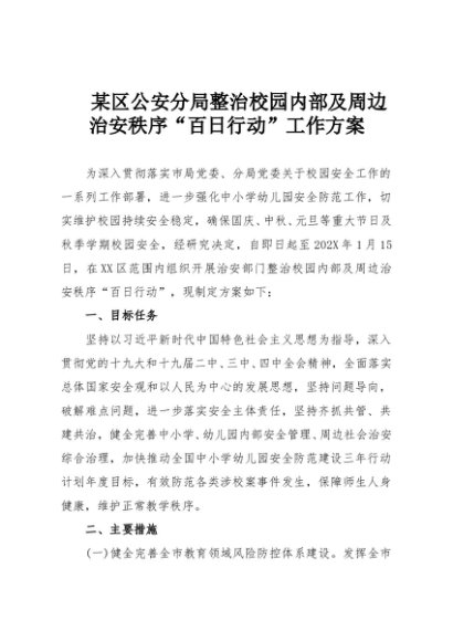 【七哥公文】2025年:某区公安分局整治校园内部及周边治安秩序“百日行动”工作方案+更多免费公文+VX:QiGeGongWen2024