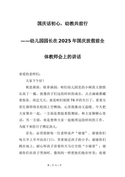 【七哥公文】2025年:幼儿园园长在2025年国庆放假前全体教师会上的讲话:国庆话初心,幼教共前行+更多免费公文+VX:QiGeGongWen2024