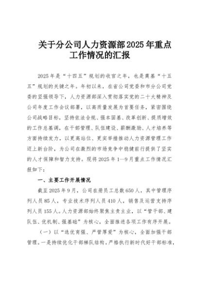 / 【七哥公文】2025年:关于分公司人力资源部2025年重点工作情况的汇报+更多免费公文+VX:QiGeGongWen2024