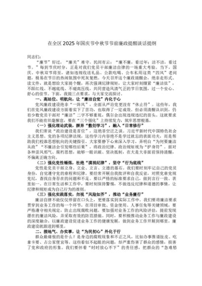 【七哥公文】2025年:【七哥公文】在全区2025年国庆节中秋节节前廉政提醒谈话提纲+更多免费公文+VX:QiGeGongWen2024