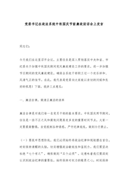 【七哥公文】2025年:【七哥公文】党委书记在政法系统中秋国庆节前廉政谈话会上发言+更多免费公文+VX:QiGeGongWen2024