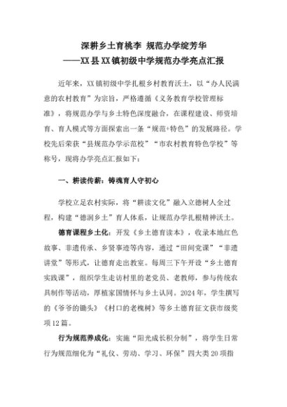 【七哥公文】2025年:深耕乡土育桃李 规范办学绽芳华——XX县XX镇初级中学规范办学亮点汇报+更多免费公文+VX:QiGeGongWen2024