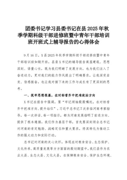 【七哥公文】2025年:团委书记学习县委书记在县2025年秋季学期科级干部进修班暨中青年干部培训班开班式上辅导报告的心得体会+更多免费公文+VX:QiGeGongWen2024