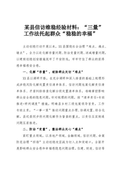 【七哥公文】2025年:某县信访维稳经验材料:“三量”工作法托起群众“稳稳的幸福”+更多免费公文+VX:QiGeGongWen2024