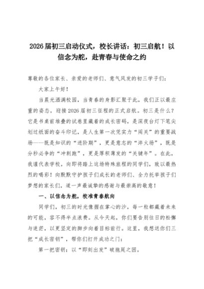 【七哥公文】2025年:2026届初三启动仪式,校长讲话:初三启航!以信念为舵,赴青春与使命之约+更多免费公文+VX:QiGeGongWen2024