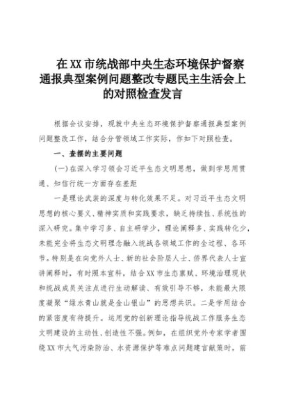 【七哥公文】2025年:在XX市统战部中央生态环境保护督察通报典型案例问题整改专题民主生活会上的对照检查发言+更多免费公文+VX:QiGeGongWen2024