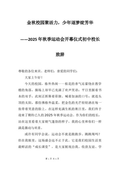 【七哥公文】2025年:2025年秋季运动会开幕仪式初中校长致辞:金秋校园聚活力,少年逐梦绽芳华+更多免费公文+VX:QiGeGongWen2024