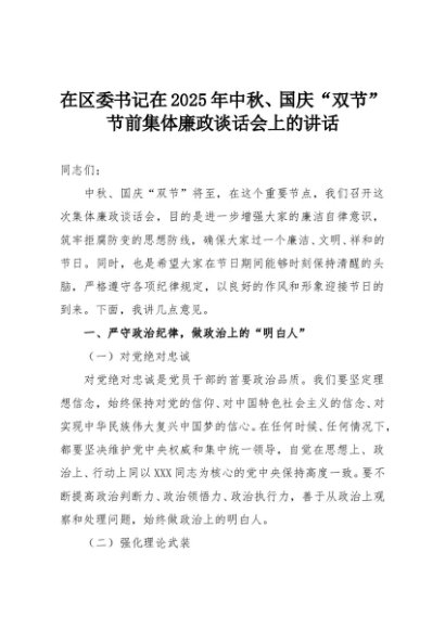 【七哥公文】2025年:在区委书记在2025年中秋、国庆“双节”节前集体廉政谈话会上的讲话+更多免费公文+VX:QiGeGongWen2024