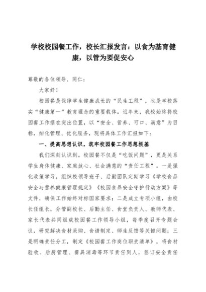 【七哥公文】2025年:学校校园餐工作,校长汇报发言:以食为基育健康,以管为要促安心+更多免费公文+VX:QiGeGongWen2024