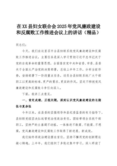【七哥公文】2025年:在XX县妇女联合会2025年党风廉政建设和反腐败工作推进会议上的讲话(精品)+更多免费公文+VX:QiGeGongWen2024