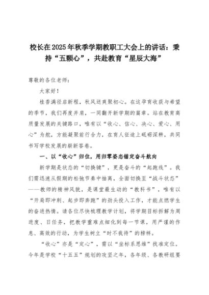 【七哥公文】2025年:校长在2025年秋季学期教职工大会上的讲话:秉持“五颗心”,共赴教育“星辰大海”+更多免费公文+VX:QiGeGongWen2024