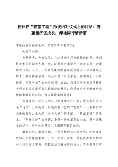 【七哥公文】2025年:校长在“青蓝工程”师徒结对仪式上的讲话:青蓝相济促成长,师徒同行谱新篇+更多免费公文+VX:QiGeGongWen2024