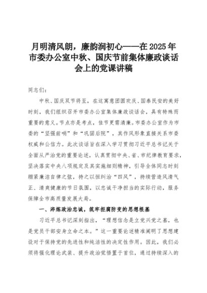 【七哥公文】2025年:月明清风朗,廉韵润初心——在2025年市委办公室中秋、国庆节前集体廉政谈话会上的党课讲稿+更多免费公文+VX:QiGeGongWen2024