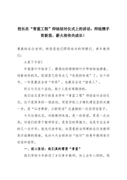 【七哥公文】2025年:校长在“青蓝工程”师徒结对仪式上的讲话:师徒携手育新苗,薪火相传共成长!+更多免费公文+VX:QiGeGongWen2024