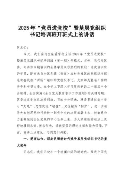 【七哥公文】2025年:2025年“党员进党校”暨基层党组织书记培训班开班式上的讲话+更多免费公文+VX:QiGeGongWen2024