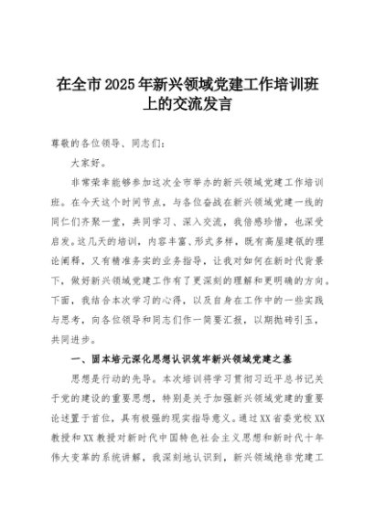 / 【七哥公文】2025年:在全市2025年新兴领域党建工作培训班上的交流发言+更多免费公文+VX:QiGeGongWen2024