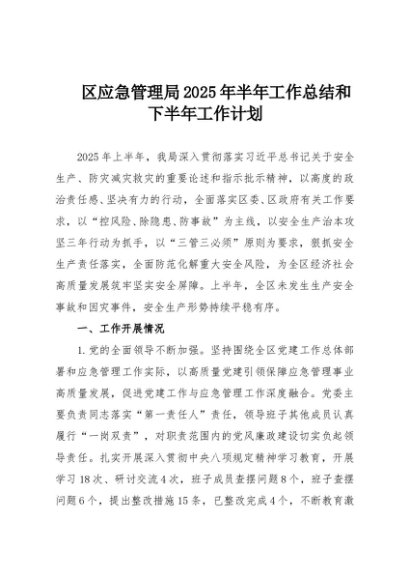 / 【七哥公文】2025年:区应急管理局2025年半年工作总结和下半年工作计划+更多免费公文+VX:QiGeGongWen2024