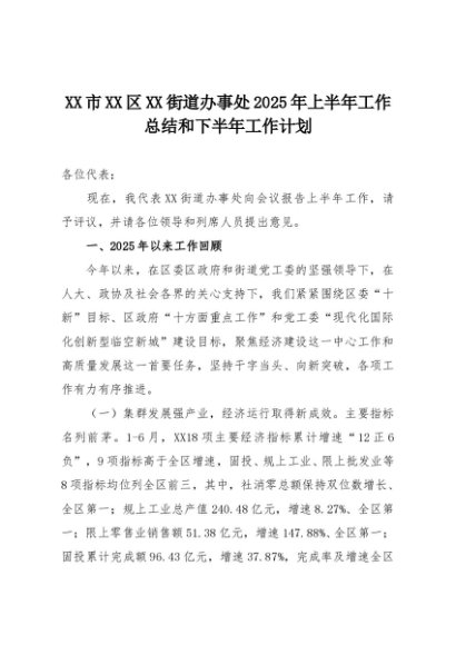 【七哥公文】2025年:XX市XX区XX街道办事处2025年上半年工作总结和下半年工作计划+更多免费公文+VX:QiGeGongWen2024