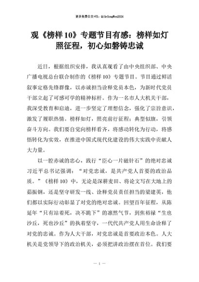 【七哥公文】2026年:观《榜样10》专题节目有感:榜样如灯照征程,初心如磐铸忠诚+更多免费公文+VX:QiGeGongWen2024