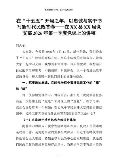【七哥公文】2026年:在“十五五”开局之年,以忠诚与实干书写新时代民政答卷——在XX县XX局党支部2026年第一季度党课上的讲稿+更多免费公文+VX:QiGeGongWen2024