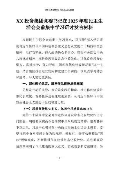 【七哥公文】2026年:XX投资集团党委书记在2025年度民主生活会会前集中学习研讨发言材料+更多免费公文+VX:QiGeGongWen2024 - 七哥-AI智库
