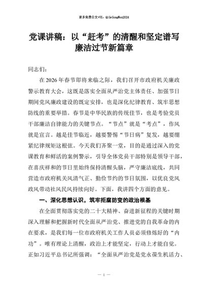 【七哥公文】2026年:党课讲稿:以“赶考”的清醒和坚定谱写廉洁过节新篇章+更多免费公文+VX:QiGeGongWen2024 - 七哥-AI智库
